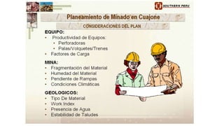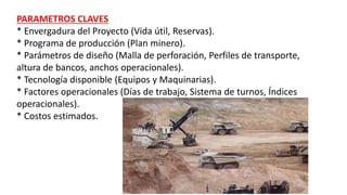 El documento trata sobre el dimensionamiento de flotas de equipos para minería a cielo abierto. Explica cómo calcular el número de perforadoras y cargadores frontales necesarios considerando parámetros como la producción diaria requerida, las características de los equipos, índices operacionales y factores de corrección.