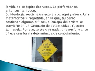 El documento trata sobre el performance como forma artística que utiliza el cuerpo y comportamientos corporales para transmitir significados sociales y de identidad. Los performances operan como actos en vivo que comunican saberes, memoria e identidad a través de acciones repetidas. El performance se ha expandido más allá de las artes visuales y el teatro para incluir casi todos los ámbitos de la vida humana, por lo que ya no solo los artistas crean performances sino también personas comunes en su vida cotidiana.