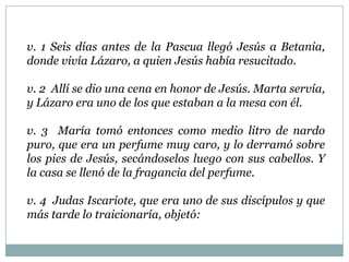 El documento resume un pasaje bíblico donde María unge a Jesús con un perfume caro antes de su muerte. Judas critica esto y sugiere que el perfume se venda para dar a los pobres, aunque en realidad está interesado en robar el dinero. Jesús defiende a María y dice que ella lo ha guardado para su entierro. El documento contrasta la actitud generosa de María con la avaricia de Judas y exhorta a los lectores a honrar a Jesús con sus mejores dones como María.