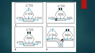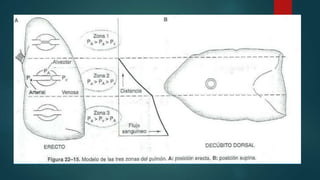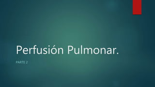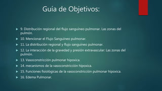 Este documento discute la perfusión pulmonar y la distribución regional del flujo sanguíneo pulmonar. Explica que la gravedad y las presiones extravasculares afectan la perfusión relativa de diferentes áreas del pulmón, creando zonas de flujo sanguíneo. También cubre la vasoconstricción pulmonar hipóxica, que desvía el flujo sanguíneo lejos de las áreas mal ventiladas, y los factores que influyen en el movimiento de líquido y el edema pulmonar.