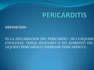 La pericarditis es la inflamación del pericardio que puede estar asociada a un aumento del líquido pericardico. Se clasifica en agudas o crónicas dependiendo de si dura menos o más de 6 semanas. Las agudas pueden ser secas o con derrame y las de derrame pueden ser constrictivas o no. El tratamiento de las agudas incluye antiinflamatorios y corticoides. El taponamiento cardíaco requiere pericardiocentesis para extraer líquido.