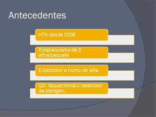 El documento presenta un caso clínico con dificultad respiratoria, describiendo síntomas como disnea, tos, dolor precordial y fiebre, además de una serie de estudios y diagnósticos relacionados con fibrosis pericárdica y lupus eritematoso sistémico. Se destacan los resultados de paraclínicos, biopsias y el análisis del compromiso cardiovascular en el contexto de las enfermedades autoinmunes. Se aborda el manejo de la pericarditis lúpica y sus complicaciones, resaltando la importancia del diagnóstico diferencial y la intervención médica oportuna.