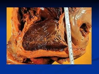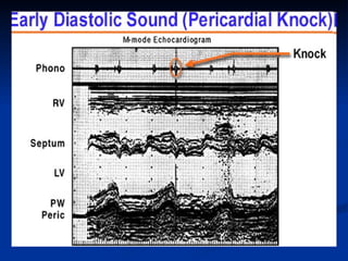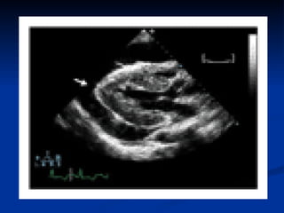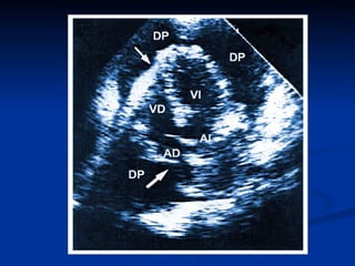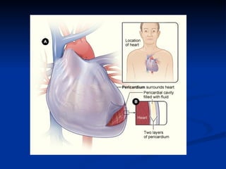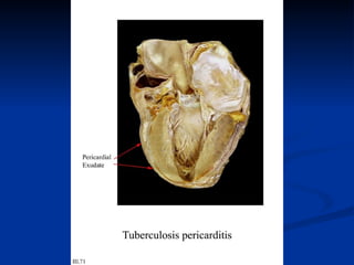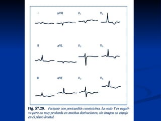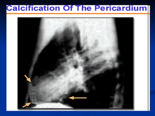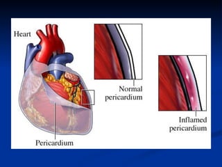 El documento proporciona información sobre diferentes tipos de pericarditis, incluyendo pericarditis aguda, taponamiento cardíaco, pericarditis con derrame pericárdico crónico y pericarditis constrictiva. Describe los síntomas, hallazgos físicos, pruebas de diagnóstico y opciones de tratamiento para cada una, con énfasis en el tratamiento quirúrgico de la pericarditis constrictiva a través de la pericardiectomía.