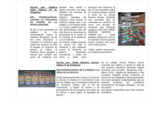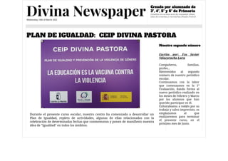 Durante el curso escolar, el CEIP Divina Pastora ha comenzado a desarrollar un Plan de Igualdad con actividades relacionadas a fechas como el Día Internacional contra la Violencia de Género y el Día Internacional de la Mujer, en las que los alumnos participaron en la construcción de un muro con mensajes de paz y la lectura de cuentos. El colegio también celebró el Día Internacional de la Mujer y la Niña en la Ciencia conociendo la vida de mujeres científicas e hicieron un mural con sus imá