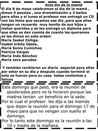 Este resumen cubre las principales noticias de la semana del 15 al 24 de mayo en el diario escolar "El Escolar". Se celebró el Día de la Madre con un acto y se entregaron regalos a las mamás. La reunión de apoderados se pospuso al domingo 17. El colegio postula a un proyecto en tecnología y el profesor enseña a usar el blog. Los profesores anunciaron un paro indefinido.
