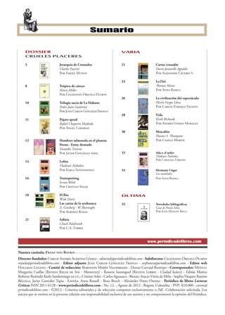 Este número de la revista Periódico de Libros presenta un dossier sobre "Crueles Placeres" que incluye resúmenes y análisis de obras literarias que exploran temas como la infidelidad, el hedonismo, los paraísos artificiales y el desenfreno. Entre las obras analizadas se encuentran Jerarquía de Cornudos de Charles Fourier, Trópico de Cáncer de Henry Miller y obras de Pedro Juan Gutiérrez, Irvine Welsh, Chuck Palahniuk y otros. El dossier también presenta ilustraciones del artista Franz