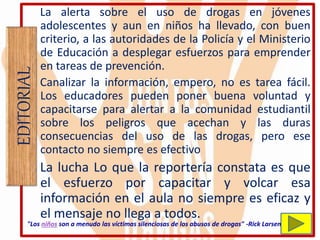 El documento habla sobre los esfuerzos de las autoridades para prevenir el uso de drogas entre los jóvenes a través de la educación y la capacitación. Sin embargo, señala que estos mensajes de prevención no siempre son efectivos y no llegan a todos los estudiantes. Además, fuera de los centros educativos operan redes de tráfico de drogas que atraen a los jóvenes, por lo que se requiere de un esfuerzo conjunto entre la policía, el ministerio de educación, maestros y familias.