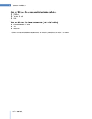 El documento clasifica y describe los diferentes tipos de periféricos de una computadora. Los periféricos son dispositivos electrónicos que se conectan a una computadora pero no forman parte de sus componentes centrales. Se clasifican como de entrada, salida, almacenamiento o comunicación dependiendo del flujo principal de datos. Algunos ejemplos comunes de periféricos de entrada son el teclado, mouse y micrófono, mientras que los periféricos de salida incluyen el monitor, impresora y altavoces.