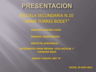 Este documento presenta un proyecto escolar sobre periféricos realizado por tres estudiantes de tercer grado para la clase de Computación. El proyecto describe brevemente los periféricos de entrada, que capturan y digitalizan datos para enviarlos al ordenador, los de salida, que muestran información para el usuario, y los de entrada/salida, que permiten el intercambio de información entre el ordenador y el usuario.