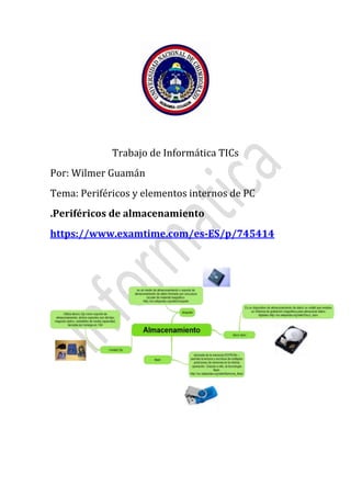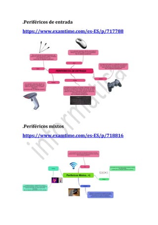 El documento habla sobre los periféricos y elementos internos de una computadora personal. Explica los diferentes tipos de periféricos como periféricos de almacenamiento, entrada, mixtos y salida. También cubre los elementos internos clave de una PC como la placa base, procesador y memoria.