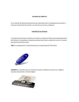 Este documento describe diferentes tipos de periféricos de entrada, salida y comunicación para sistemas de computo. Entre los periféricos de entrada se incluyen el USB, escáner, mouse, teclado, micrófono, lápiz óptico y cámara web. Los periféricos de salida mencionados son el monitor, impresora, tarjeta de sonido, auriculares y parlantes. Los periféricos de comunicación descritos son la cámara web, modem, tarjeta de red, micrófono y tarjeta WiFi.