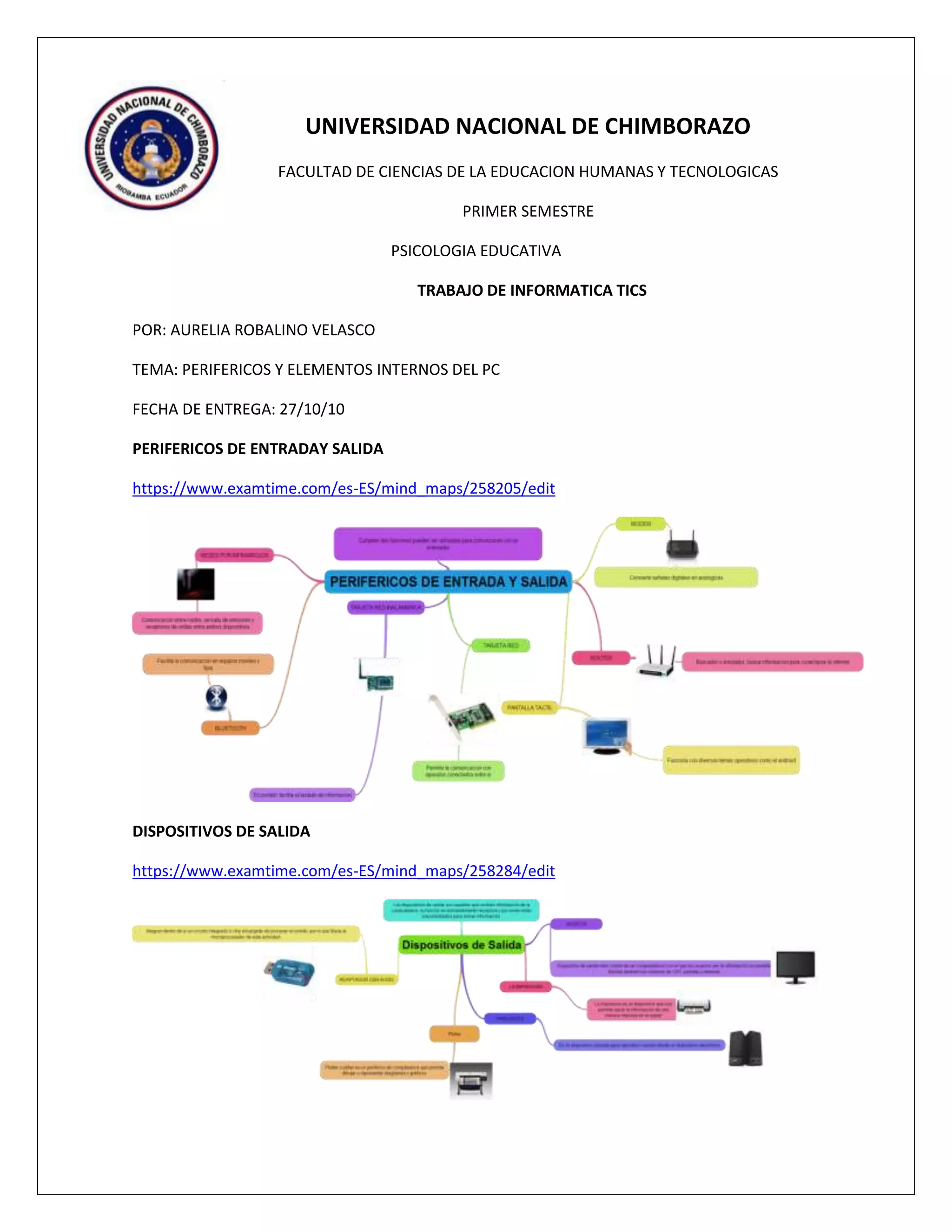 Este documento presenta un trabajo de informática sobre los periféricos y elementos internos de una computadora personal. Incluye secciones sobre periféricos de entrada y salida, dispositivos de salida, periféricos de entrada, dispositivos de almacenamiento y elementos internos de la unidad central de procesamiento, con enlaces a mapas mentales sobre cada tema.