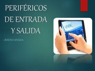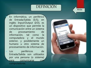 Este documento define los periféricos de entrada/salida como dispositivos que permiten la comunicación entre un sistema de procesamiento de información como una computadora y el mundo exterior. Proporciona ejemplos de periféricos de entrada/salida como pantallas táctiles, impresoras multifunción y cascos virtuales. También menciona que los dispositivos de almacenamiento y redes a veces se consideran periféricos de entrada/salida.