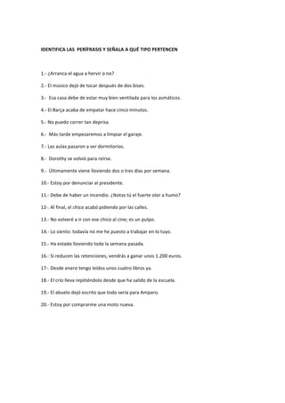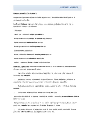Este documento describe las diferentes clases de perífrasis verbales en español, incluyendo perífrasis modales, aspectuales y ejemplos de cada tipo. Las perífrasis modales expresan obligación, probabilidad o posibilidad. Las perífrasis aspectuales informan sobre el desarrollo de la acción verbal, incluyendo perífrasis ingresivas, incoativas, reiterativas, perfectivas y durativas. El documento también presenta ejercicios de identificación de perífrasis verbales y su clasificación.