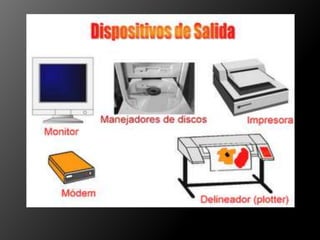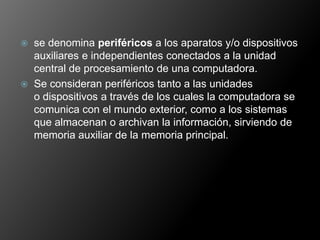 Los periféricos son dispositivos auxiliares conectados a la computadora que capturan datos de entrada del usuario o de otros dispositivos y los envían al procesador, o muestran información de salida de la computadora al usuario. Los periféricos se clasifican en de entrada, salida, y entrada/salida, y sirven para comunicar la computadora con el mundo exterior y almacenar información.