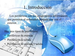 Este documento describe los diferentes tipos de periféricos de un ordenador, incluyendo periféricos de entrada como el teclado y el ratón que permiten introducir datos, periféricos de salida como el monitor y la impresora que muestran u obtienen la salida de datos, y periféricos de entrada y salida como el módem y los teléfonos móviles que permiten tanto la entrada como la salida de datos.