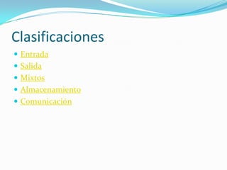 Este documento clasifica y describe los diferentes tipos de periféricos de una computadora. Los periféricos se dividen en de entrada, salida, mixtos, almacenamiento y comunicación. Los periféricos de entrada permiten al usuario comunicarse con la computadora e ingresar información. Los periféricos de salida muestran los resultados de las operaciones procesadas. Los periféricos de almacenamiento guardan los datos cuando la memoria principal se borra. Y los periféricos de comunicación facilitan la interacción entre computadoras.