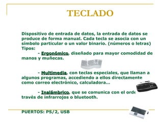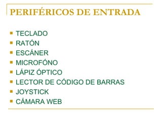 El documento describe los principales periféricos de entrada de un ordenador como el teclado, ratón, escáner, micrófono, lápiz óptico, lector de códigos de barras, joystick, y cámara web. Explica que el teclado permite la entrada manual de datos a través de teclas asociadas con símbolos o valores binarios, y que existen varios tipos como ergonómicos, multimedia e inalámbricos. Además, detalla que el ratón consta generalmente de dos o tres botones y puede usarse con cualqu