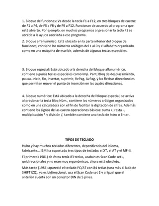 El documento describe diferentes periféricos de entrada para computadoras, incluyendo teclados, mouse, cámaras web y escáneres. Explica sus funciones, tipos y mecanismos de operación, como capturar movimiento y transmitir información a la computadora para interactuar con el usuario.