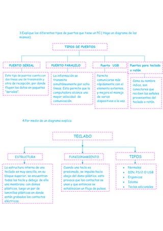 Este documento describe diferentes periféricos de entrada y salida de datos para computadoras. Explica que los periféricos de entrada permiten que el usuario se comunique con la computadora e ingrese información, como teclados, ratones y escáneres. Describe los diferentes tipos de puertos como USB, paralelo y serial. Explica el funcionamiento y estructura de teclados, ratones, escáneres y cámaras digitales. Recomienda considerar la resolución, almacenamiento, calidad óptica y conectividad al comprar una c