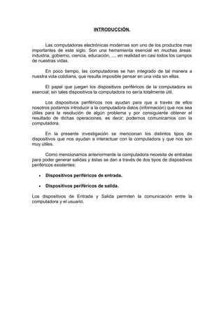 Este documento describe diferentes tipos de periféricos de computadora. Menciona dispositivos de entrada como teclados, mouse, escáneres y micrófonos que permiten introducir datos a la computadora. También describe periféricos de salida como monitores, impresoras y altavoces que muestran la información procesada. Por último, explica dispositivos de almacenamiento como discos duros, CDs, memorias USB y tarjetas que guardan datos de forma permanente o temporal.