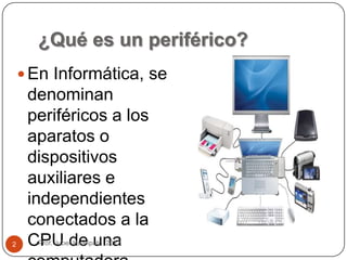 Este documento describe los diferentes tipos de periféricos de una computadora personal. Existen cuatro tipos principales de periféricos: periféricos de entrada, que capturan datos; periféricos de salida, que muestran información; periféricos de almacenamiento, que guardan datos; y periféricos de comunicación, que permiten la interacción entre computadoras.