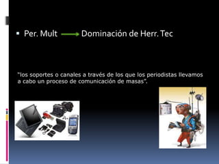 El documento discute el concepto de periodista multimedia y la industria de contenidos digitales. Resalta que el periodista multimedia debe dominar diferentes plataformas como prensa, radio, televisión e internet. También destaca que la industria de contenidos digitales ha reemplazado al concepto de industrias culturales debido a la convergencia digital y las posibilidades de participación ciudadana e inclusión social. Finalmente, propone la creación de centros de excelencia en producción de contenidos digitales interactivos e interoperables.