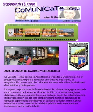 El documento habla sobre la Escuela Normal asumiendo un proceso de acreditación de calidad que implicó una reevaluación de sus prácticas educativas y culturales. Un aspecto clave fue la práctica pedagógica de los estudiantes en diferentes entornos de aprendizaje. La escuela también creó espacios para la formación continua de maestros y la investigación colaborativa.