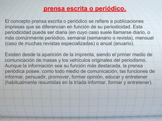 La prensa escrita o periódico se refiere a publicaciones impresas de forma periódica que tienen como función principal informar, persuadir, promover, formar opinión y entretener. Los primeros ejemplos datan de la antigua Roma y China, pero su desarrollo masivo se dio a partir de la invención de la imprenta por Gutenberg. En la actualidad existen diferentes formatos como el berliner, tabloide y broadsheet, y los periódicos buscan mejorar su credibilidad a través de políticas de ética y transparencia con