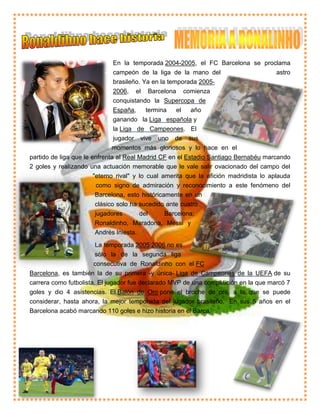 El documento resume la temporada 2005-2006 del FC Barcelona, en la que ganaron la Liga española, la Supercopa de España y la Liga de Campeones, liderados por el astro brasileño Ronaldinho. También menciona que Lionel Messi rompió el récord goleador del Barcelona al anotar su gol 232.