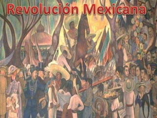 La Revolución Mexicana comenzó en 1910 debido a la dictadura de Porfirio Díaz y la desigualdad social. Líderes como Francisco Madero, Pancho Villa y Emiliano Zapata lideraron la rebelión contra Díaz. Tras la renuncia de Díaz en 1911, la revolución continuó buscando reformas agrarias y económicas. La Constitución de 1917 promulgada por Venustiano Carranza incluyó importantes derechos laborales y la reforma agraria. La muerte de Carranza