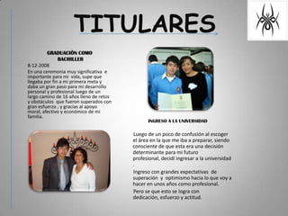 Este documento resume los principales hitos y aspectos de la vida del autor hasta el momento. Incluye su graduación de bachiller, ingreso a la universidad con grandes expectativas, el apoyo de su familia y amigos cercanos, sus aficiones como escuchar música y practicar deportes como el ultimate, y cómo valora tener una vida sana y equilibrada más que lujos materiales.
