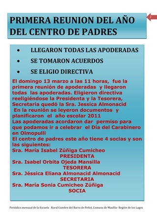 Este documento resume las noticias de la Escuela Rural Cumbre del Barro para el mes de marzo de 2011. Hubo la primera reunión del año del Centro de Padres, donde se eligió una nueva directiva. También vinieron trabajadores a arreglar los baños de la escuela. Hubo una ronda médica el 3 de marzo. No habrá clases los sábados debido a una nueva política del departamento provincial. Se incluyen también cuentos, números en mapudungun, colores en mapudungun y un perfil de la poet