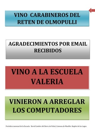 Este documento es el periódico mensual de la Escuela Rural Cumbre del Barro. Contiene noticias sobre las visitas de Carabineros y una persona que vino a arreglar los computadores de la escuela. También incluye agradecimientos por emails recibidos felicitando al periódico escolar, trabajos de los estudiantes y una sección del profesor resumiendo las actividades del mes.