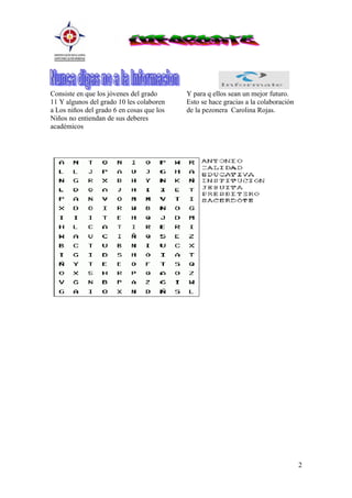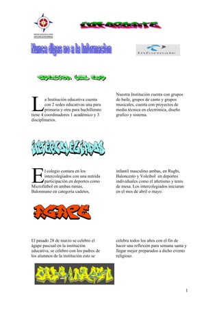 La institución educativa cuenta con 2 sedes, una para primaria y otra para bachillerato. Ofrece grupos de baile, canto y música, así como programas técnicos en electrónica, diseño gráfico y sistemas. Participará en deportes como microfútbol, balonmano, rugby, baloncesto y voleibol en los intercolegiados de abril o mayo. Celebra un ágape pascual anual con los padres para prepararse para la Semana Santa. Los estudiantes de grados superiores colaboran con los de grados
