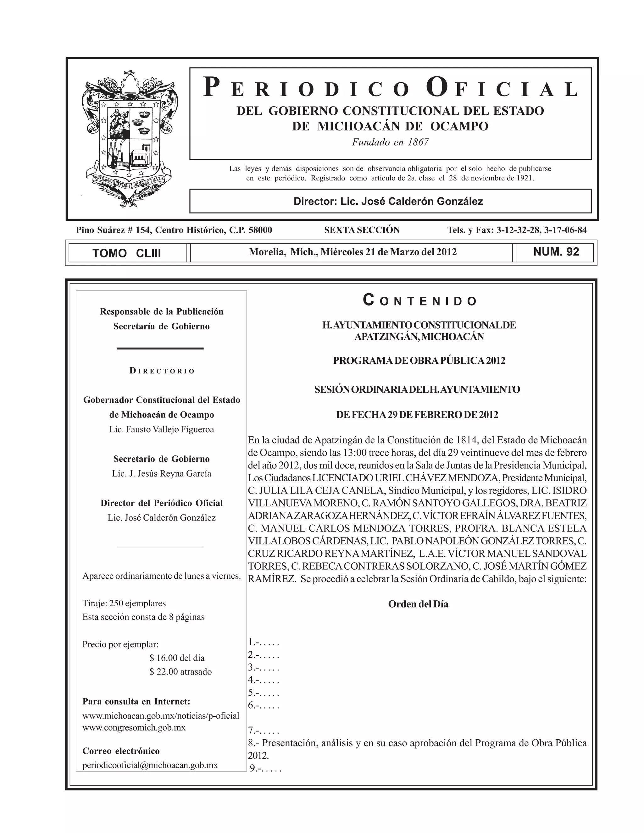 El documento presenta el Programa de Obra Pública 2012 del Ayuntamiento Constitucional de Apatzingán, Michoacán. Incluye proyectos de agua potable, alcantarillado, urbanización municipal y electrificación de colonias pobres, con un costo total de $60,415,134.29. Los recursos provendrán principalmente de fondos federales y estatales, con una pequeña parte de recursos propios y fondos municipales. El cabildo aprobó el programa por unanimidad.