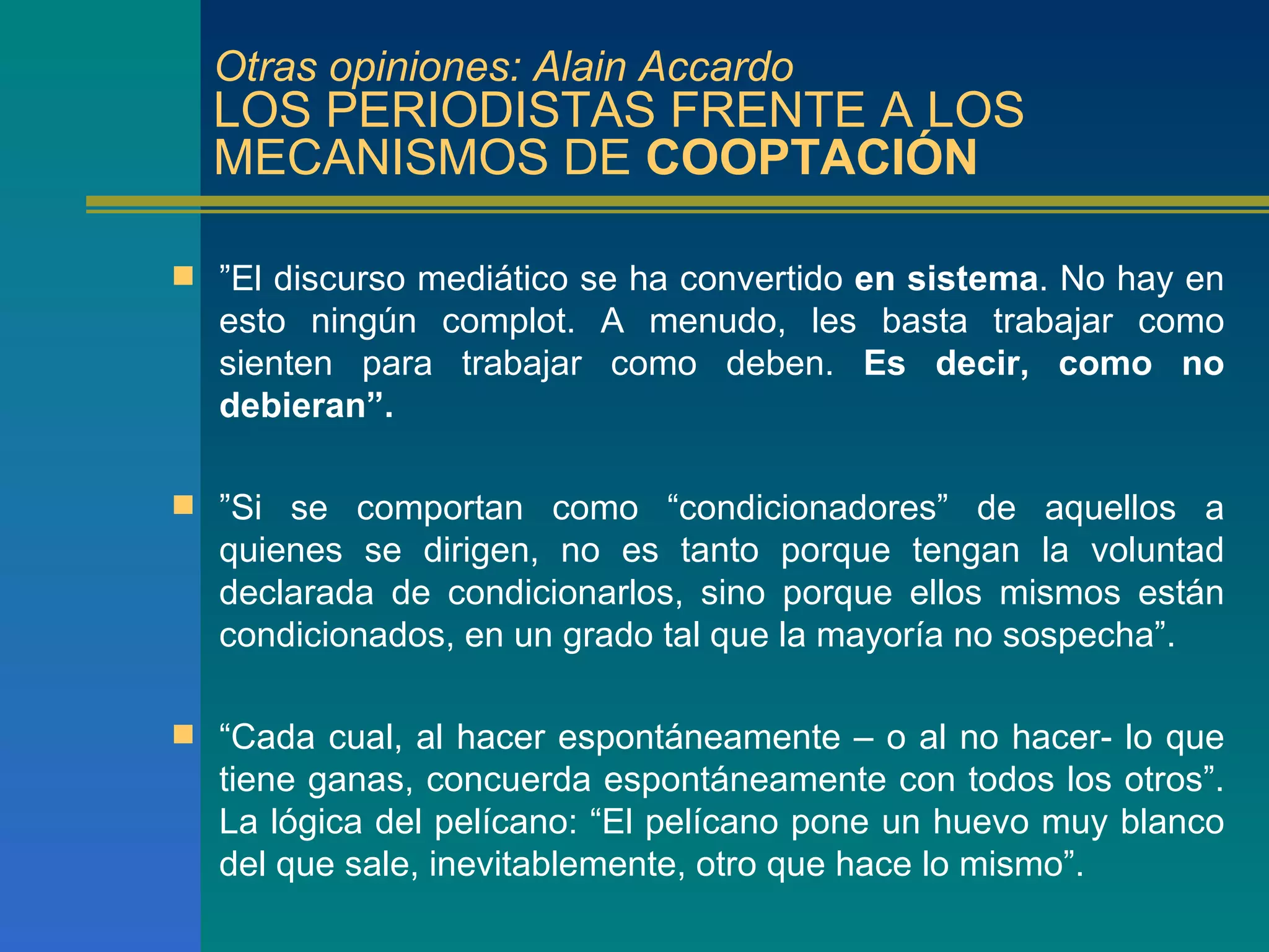 Este documento discute cómo los periodistas a menudo son cooptados por los mecanismos del sistema mediático sin darse cuenta. Aunque no hay un complot, trabajan de forma que defienden los valores dominantes sin cuestionarlos. Esto ocurre porque ellos mismos están condicionados por la lógica del sistema, lo cual lleva a una frustración constante. Para romper este ciclo, los periodistas deben comprometerse activamente a cuestionar la lógica del sistema.