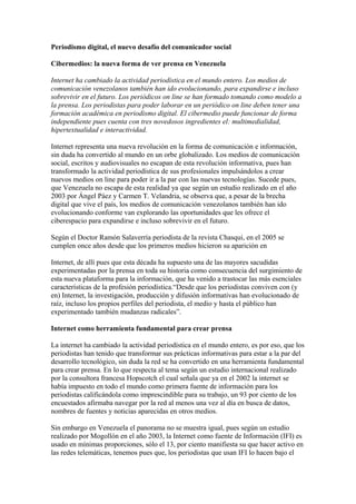 Internet ha cambiado la actividad periodística, obligando a los medios venezolanos a evolucionar y crear cibermedios. Los cibermedios toman como modelo la prensa pero aprovechan recursos como la multimedialidad, hipertextualidad e interactividad para ofrecer nuevos géneros como la infografía digital e hipertexto. Los periodistas deben capacitarse en periodismo digital para sacar el máximo provecho de las herramientas multimedia en la red y crear contenido adecuado para el formato digital.