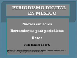 Este documento resume los principales cambios y retos que enfrentan los periodistas ante el crecimiento de Internet y las redes sociales. Señala que ahora existen muchos más emisores de información, incluyendo ciudadanos reporteros con blogs, lo que ha llevado a que los medios tradicionales ya no sean la única fuente de noticias. Los periodistas ahora deben usar mejor las herramientas digitales para difundir contenido en tiempo real y con mayor profundidad, mientras garantizan la ética y veracidad de la información en este nuevo panorama.