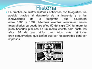 El fotoperiodismo es un género periodístico que utiliza fotografía, diseño gráfico y video para ilustrar historias noticiosas. Tuvo su edad dorada entre 1930 y 1950 debido a avances tecnológicos en fotografía y un mayor alcance periodístico. Eventos como los atentados del 11 de septiembre de 2001, la invasión de Iraq en 2003 y el tsunami en el Océano Índico en 2004 han influenciado el fotoperiodismo del siglo XXI.