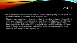 El documento describe los tres pasos para realizar un reportaje utilizando herramientas web 2.0: 1) Escoger un tema e investigar usando blogs, wikis, YouTube y sitios de noticias, 2) Escribir el reportaje en Word y publicar el enlace en Scribd, Delicious, Instagram o Facebook, 3) Subir fotos importantes a Flickr para almacenamiento en la nube.