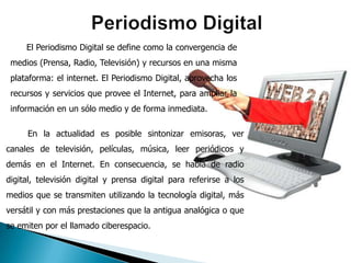 El documento describe las características del periodismo digital. Este aprovecha los recursos de Internet para converger medios como prensa, radio y televisión en una sola plataforma. Los periodistas digitales deben poder manejar múltiples plataformas, actuar en tiempo real, y aprovechar las características de la red como la hipertextualidad, multimedialidad e interactividad. El periodismo digital ofrece accesibilidad e inmediatez al permitir el acceso a la información desde cualquier lugar del mundo.