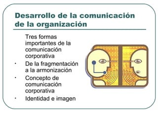 El documento habla sobre tres temas principales de la comunicación corporativa: 1) La comunicación de dirección con públicos internos y externos para lograr objetivos, 2) La comunicación de marketing para promover ventas, y 3) La comunicación organizativa que incluye varias actividades. También discute conceptos como identidad e imagen corporativa y cómo la comunicación ha evolucionado de estar fragmentada a ser más armonizada.