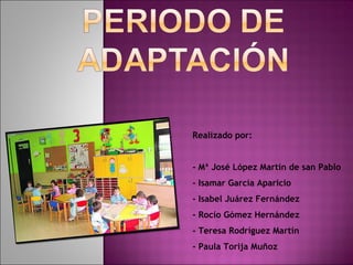 El documento presenta el plan de adaptación para un aula de educación infantil de 22 alumnos de 1o curso en Toledo. Durante las primeras semanas, el grupo se dividirá en subgrupos para realizar actividades que permitan a los niños familiarizarse con el entorno, los materiales y rutinas escolares de forma progresiva. Se evaluará el proceso de cada niño y se mantendrá comunicación con las familias.