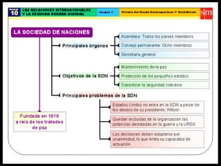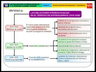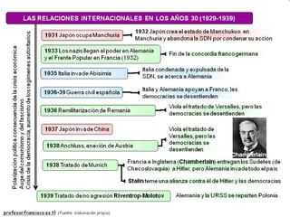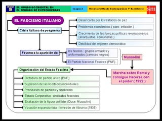 El documento describe varios factores que contribuyeron al ascenso de los fascismos en Europa entre las guerras, incluyendo la inestabilidad social y política después de la Primera Guerra Mundial, la Gran Depresión económica de 1929, y la incapacidad de los partidos políticos tradicionales para abordar estos problemas. Los fascismos italiano y alemán ofrecieron una alternativa radical basada en el nacionalismo, el autoritarismo y el control totalitario del estado.