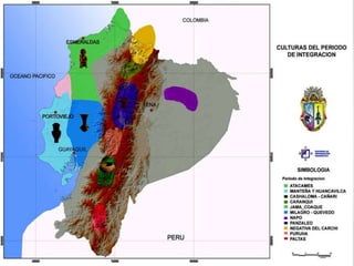 El período de integración en Ecuador ocurrió entre 700-1500 d.C. y se caracterizó por el desarrollo de sociedades jerarquizadas, la expansión territorial a través del comercio, y nuevas técnicas agrícolas como terrazas y canales de riego. Los Manteños en la costa se especializaron en la elaboración de cerámica, textiles y balsas de madera balsa, mientras que los pueblos de Milagro y Quevedo se enfocaron en la orfebrería y metalistería utilizando