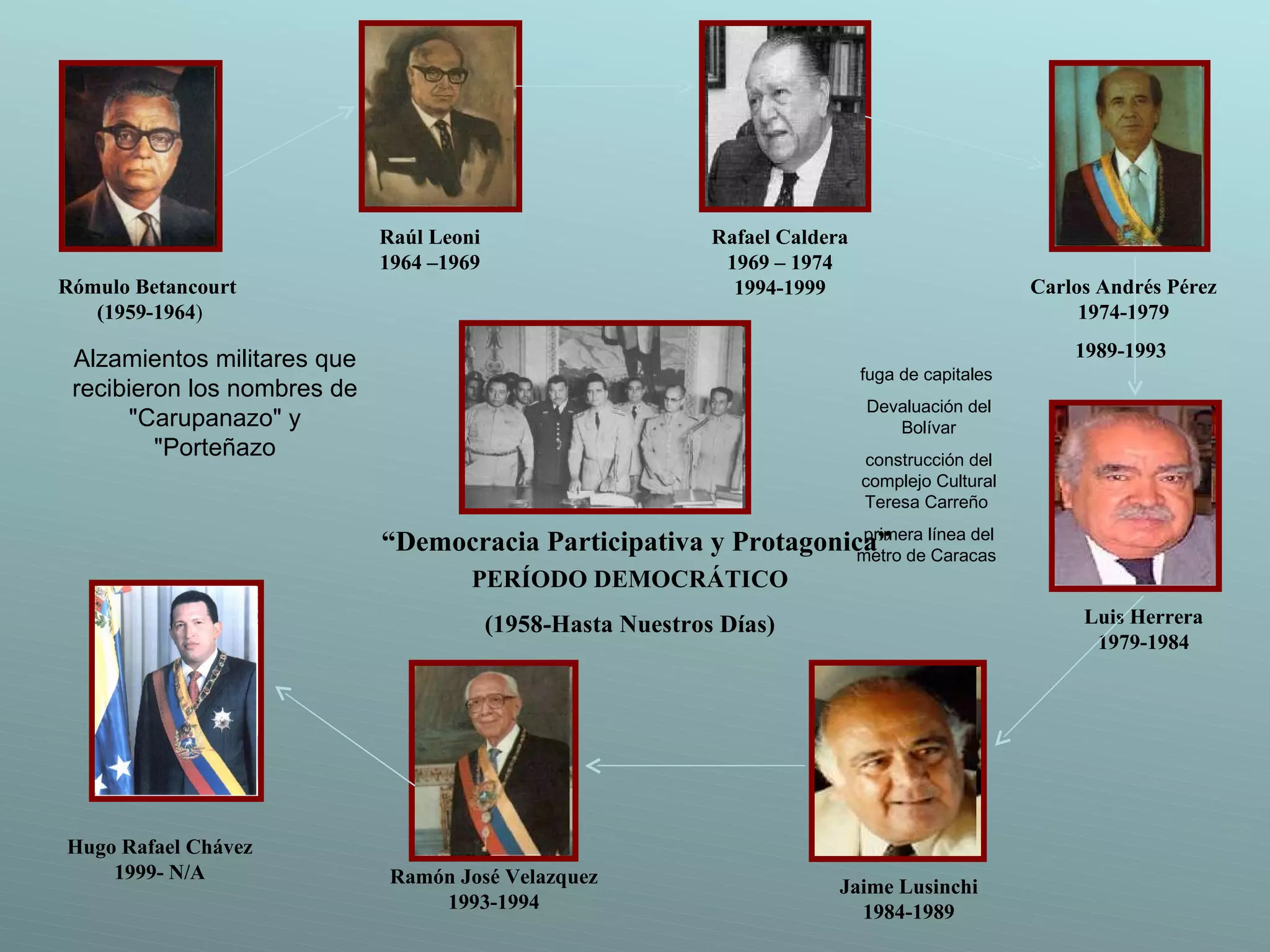 El documento resume los principales eventos políticos y económicos de Venezuela durante el período democrático desde 1958 hasta la actualidad, incluyendo los mandatos de varios presidentes como Rómulo Betancourt, Raúl Leoni, Carlos Andrés Pérez, Rafael Caldera y Hugo Chávez. Se mencionan acontecimientos como alzamientos militares, la fundación de la OPEP, programas sociales, crisis económicas y el surgimiento del populismo.