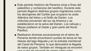Este periodo histórico de Panamá comenzó al final del Paleolítico y principios del Neolítico, cuando llegaron diversos grupos migratorios como los aborígenes del Caribe, los chibchas y los nahuas y mayas. Estos grupos se establecieron en diferentes regiones de Panamá y desarrollaron la caza, la pesca, la agricultura y la alfarería. Surgieron grandes cacicazgos, pero desafortunadamente la cultura indígena panameña fue afectada por la llegada de los europeos