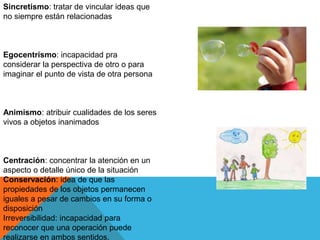 El periodo preoperacional es una etapa en el desarrollo infantil donde los niños aún no piensan lógicamente, pero comienzan a manejar el mundo simbólicamente. Durante esta fase, características como el juego simbólico, el egocentrismo y el animismo se destacan, así como diferentes formas de razonamiento, incluyendo el transductivo y el inductivo. Los niños muestran dificultad para entender conceptos como la conservación y la irreversibilidad.