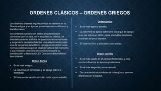 El documento describe varias obras arquitectónicas de la antigua Roma como el Coliseo en Roma, construido entre 70-80 d.C. durante la dinastía Flavia. También menciona el Panteón de Agripa en Roma del 126 d.C. y el teatro romano de Mérida promovido por el cónsul Marco Vipsanio Agripa entre 16-15 a.C. Además, explica los órdenes clásicos desarrollados en Grecia como el dórico, jónico y corintio y característic